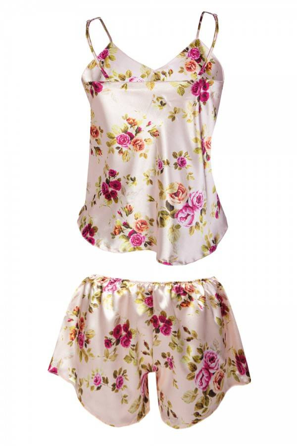 Efektowna piżama damska wykonana z delikatnej, przyjemnej dla ciała satyny. Koszulka z głębokim dekoltem na wąskich regulowanych ramiączkach. Do kompletu krótkie spodenki, o luźnym kroju.