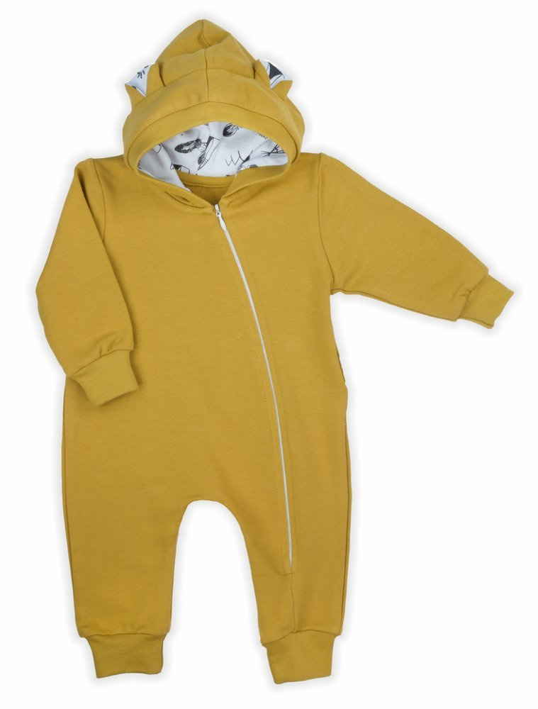 Pajac w kolorze musztardowym. Możliwość całkowitego rozpięcia umożliwia łatwe i szybkie ubieranie dziecka. Dodatkowy klin w kroku i ściągacze na stopach zapewniają swobodę użytkowania i nie krepują ruchów dziecka.
