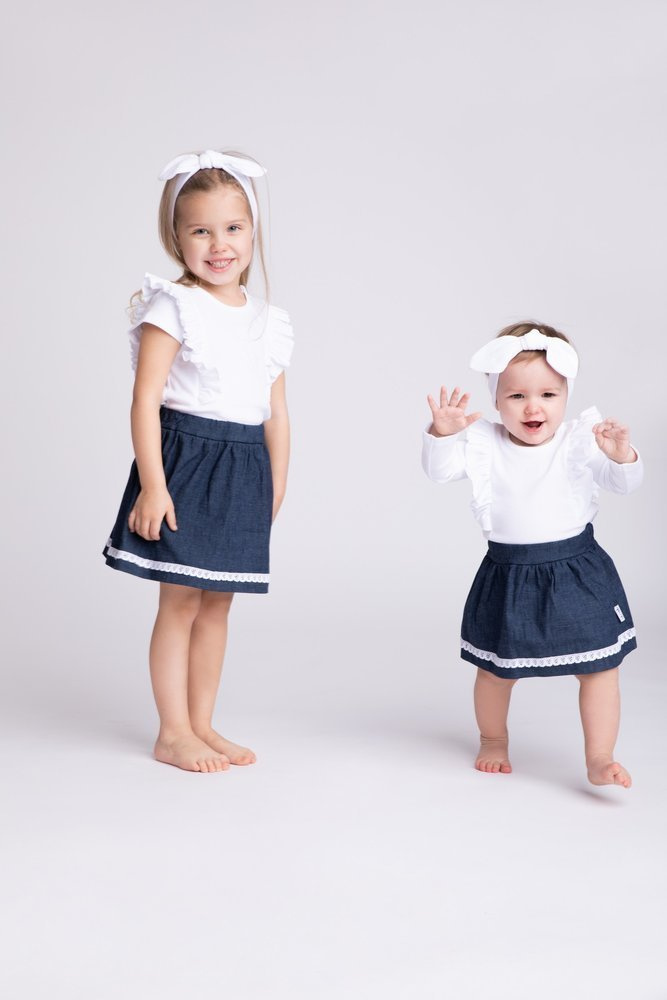 Jeansowa spódniczka dziewczęca z 100% bawełny. Ozdobna koronką, która dodaje jej uroku i zwiewności. Idealna na wiosnę i lato. W pasie wszyta jest gumka, która utrzymuje ubranko w odpowiednim miejscu, ale nie uciska w brzuszek. Luźny fason nie krępuje ruchów dziecka i zapewnia komfort noszenia. Spódniczkę można dowolnie łączyć z innymi ubrankami z kolekcji Mix, tworząc unikatowe stylizacje. Warto o niej pamiętać kompletując letnią garderobę.