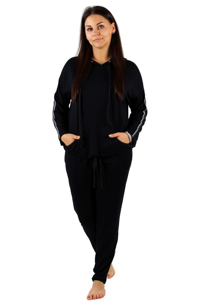Wygodny dres damski z przyjemnego dla ciała materiału. Bluza z długim rękawem i kapturem. Na wysokości brzucha kieszeń. Spodnie z kieszeniami. Pas zakończony ściągaczem. Rękawy i nogawki obszyte lamówką z napisami.