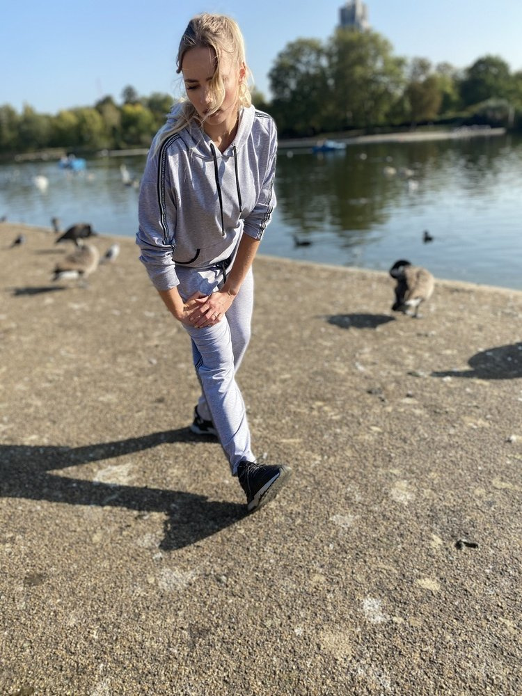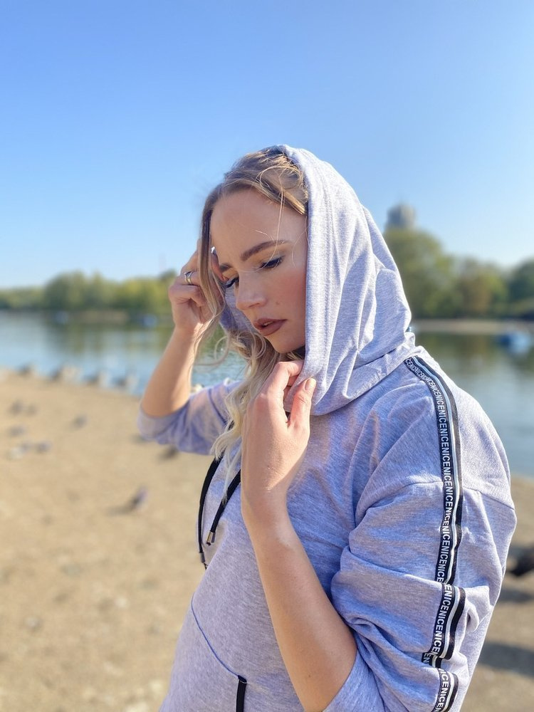 Wygodny dres damski z przyjemnego dla ciała materiału. Bluza z długim rękawem i kapturem. Na wysokości brzucha kieszeń. Spodnie z kieszeniami. Pas zakończony ściągaczem. Rękawy i nogawki obszyte lamówką z napisami.