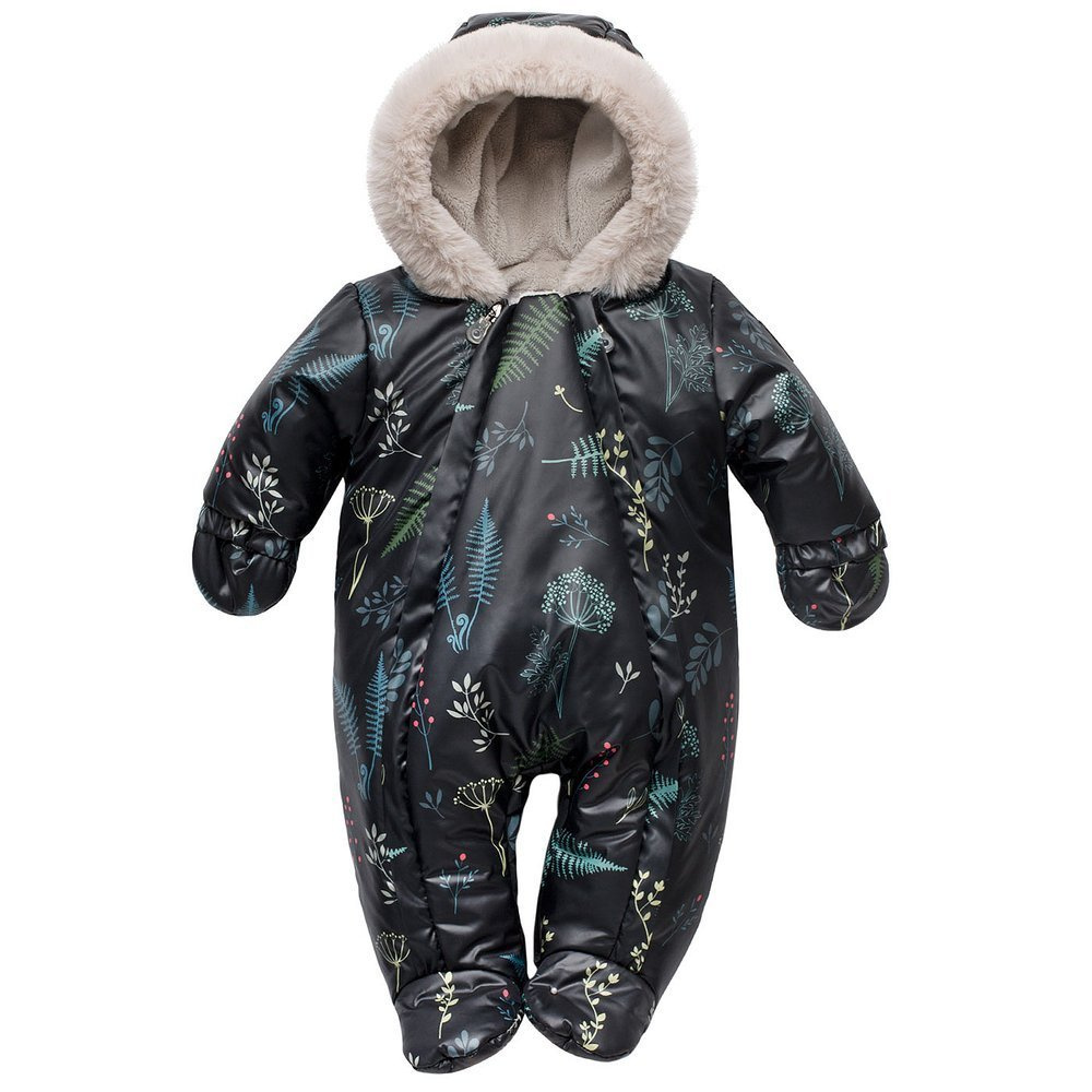 Wygodny, ciepły kombinezon niemowlęcy w czarnym kolorze, w piękny motyw roślinny.
