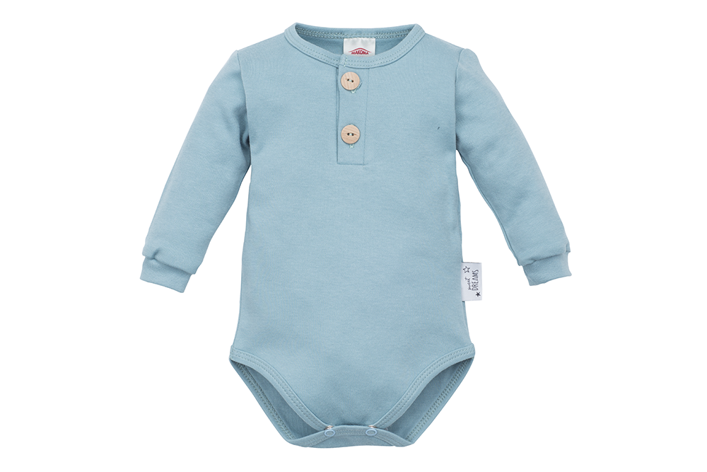 Niemowlęce body polo z długim rękawem w paski i ciekawym odcieniu niebieskiego. Nadruk wykonany został bezpieczną metodą farb wodnych, która zapewnia im trwałość nawet po wielu praniach. Body zapinane jest na ozdobne guziki.