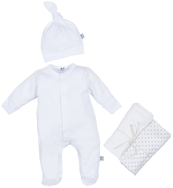 Zapytaj o produktEfektowny biały komplet dla niemowląt. W którego skład wchodzi pajacyk, czapeczka i pieluszki tetrowe. Całość wykonana jest z mięciutkiej bawełny. Doskonale sprawdzi się w pierwszych dniach życia maluszka.