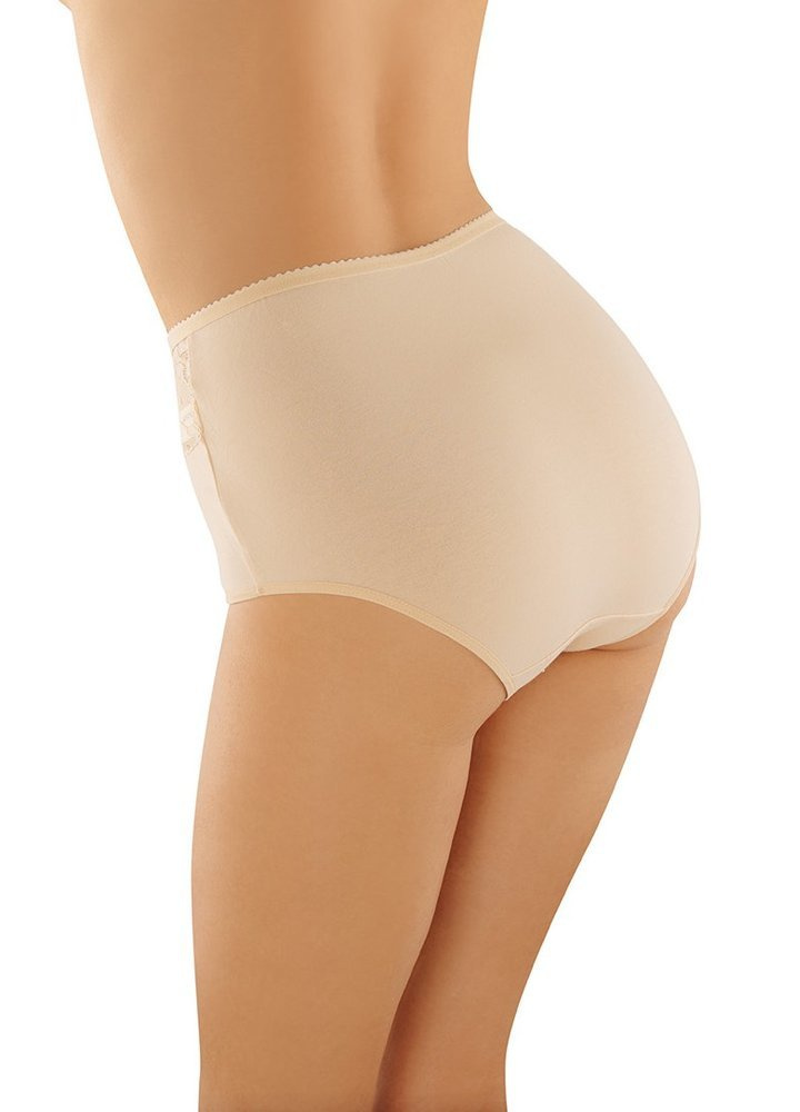 Wysokie figi damskie o klasycznym kroju. Model z delikatnej bawełny. Z przodu subtelny pas z delikatnej koronki, tył gładki. Gumka w pasie od wewnętrznej strony z sylikonem. Model pakowany w pudełko. Szczególną zaletą tego modelu jest wysokiej jakości dzianina bawełniana z dodatkiem lycra, przez co idealnie dopasowują się do ciała. Jest to materiał doskonale oddychający i przewiewny.