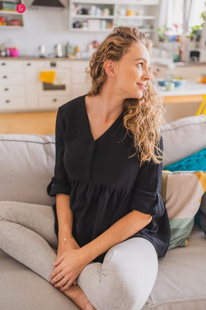 - Oversizowy krój, który pomieści ciążowy brzuszek i nie krępuje ruchów podczas opieki nad maleństwem