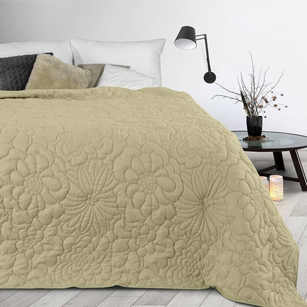 Narzuta wykonana jest z materiału przypominającego do złudzenia tkaninę bawełnianą. Jest miękka, przyjemna w dotyku, a dodatkowym jej walorem estetycznym jest element charakterystycznego przepikowanego wzoru w kwiaty na całej powierzchni, który został wykonany metodą hot press.