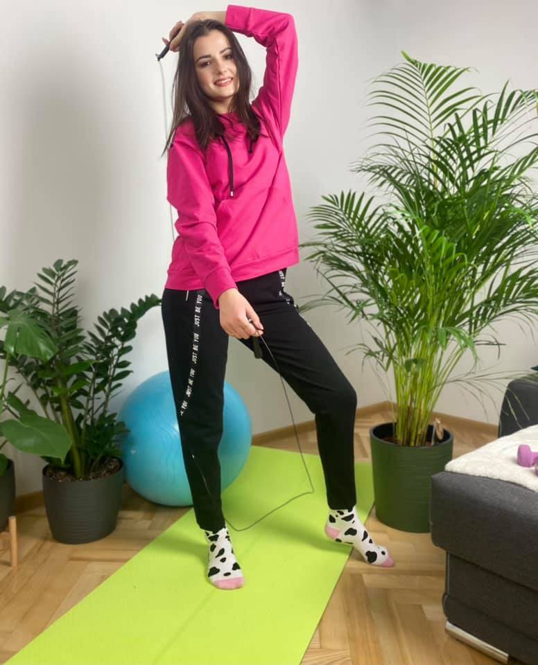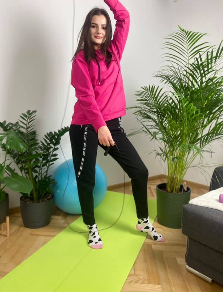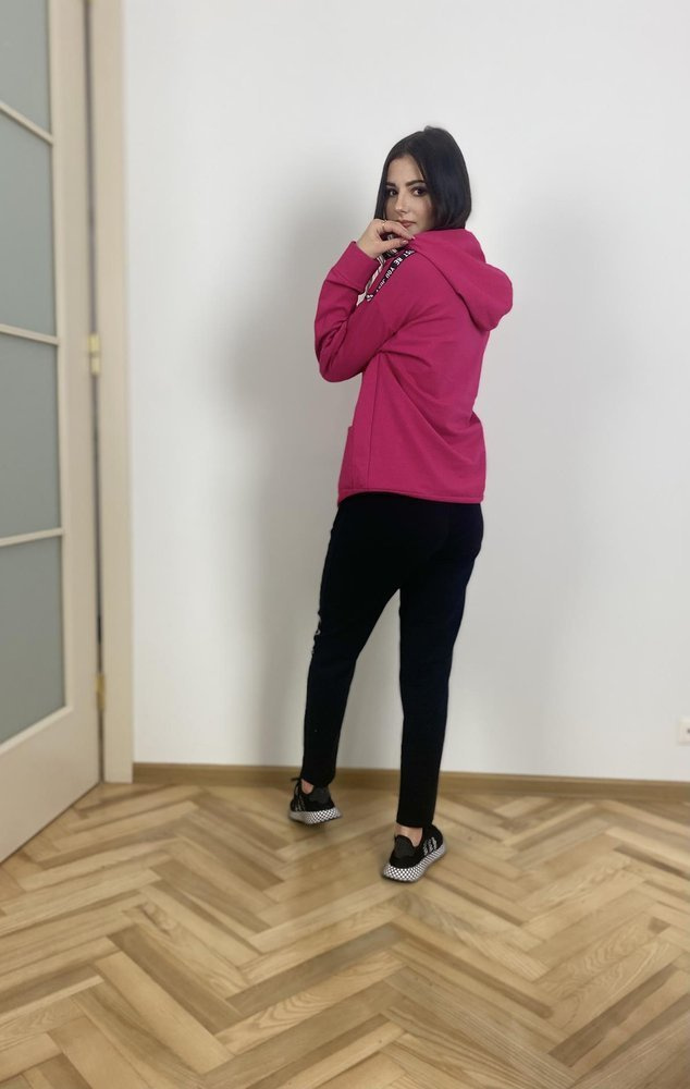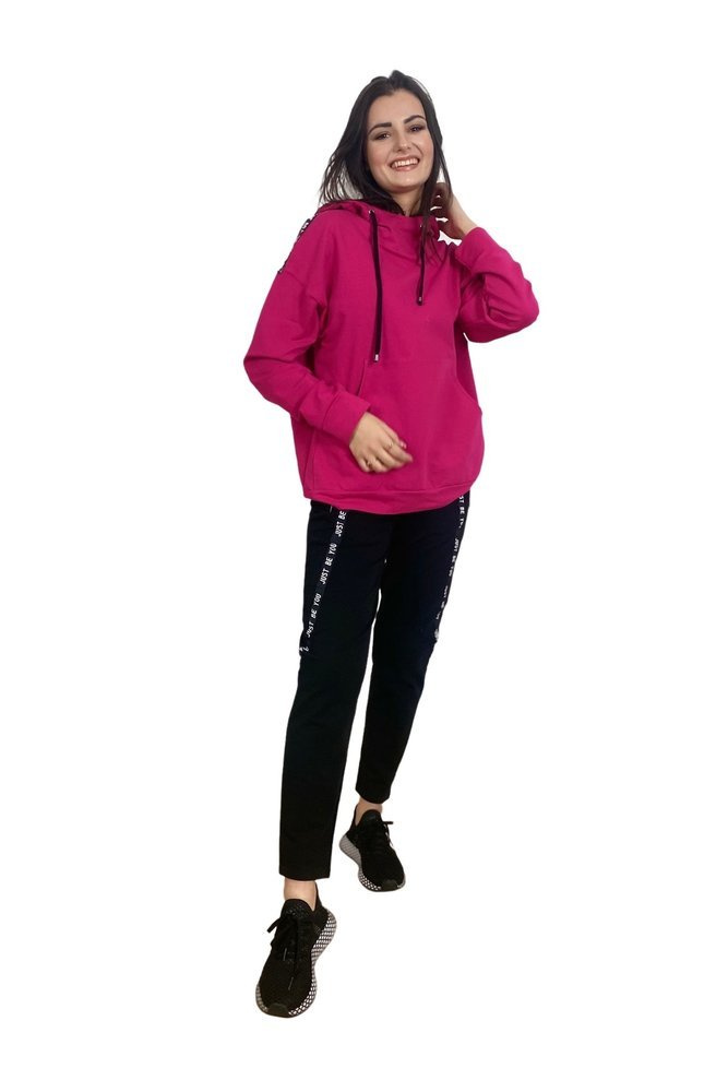 Wygodny dres damski z przyjemnego dla ciała materiału. Bluza z długim rękawem i kapturem. Na wysokości brzucha kieszeń. Spodnie z kieszeniami. Pas zakończony ściągaczem. Rękawy i nogawki obszyte lamówką z napisami.