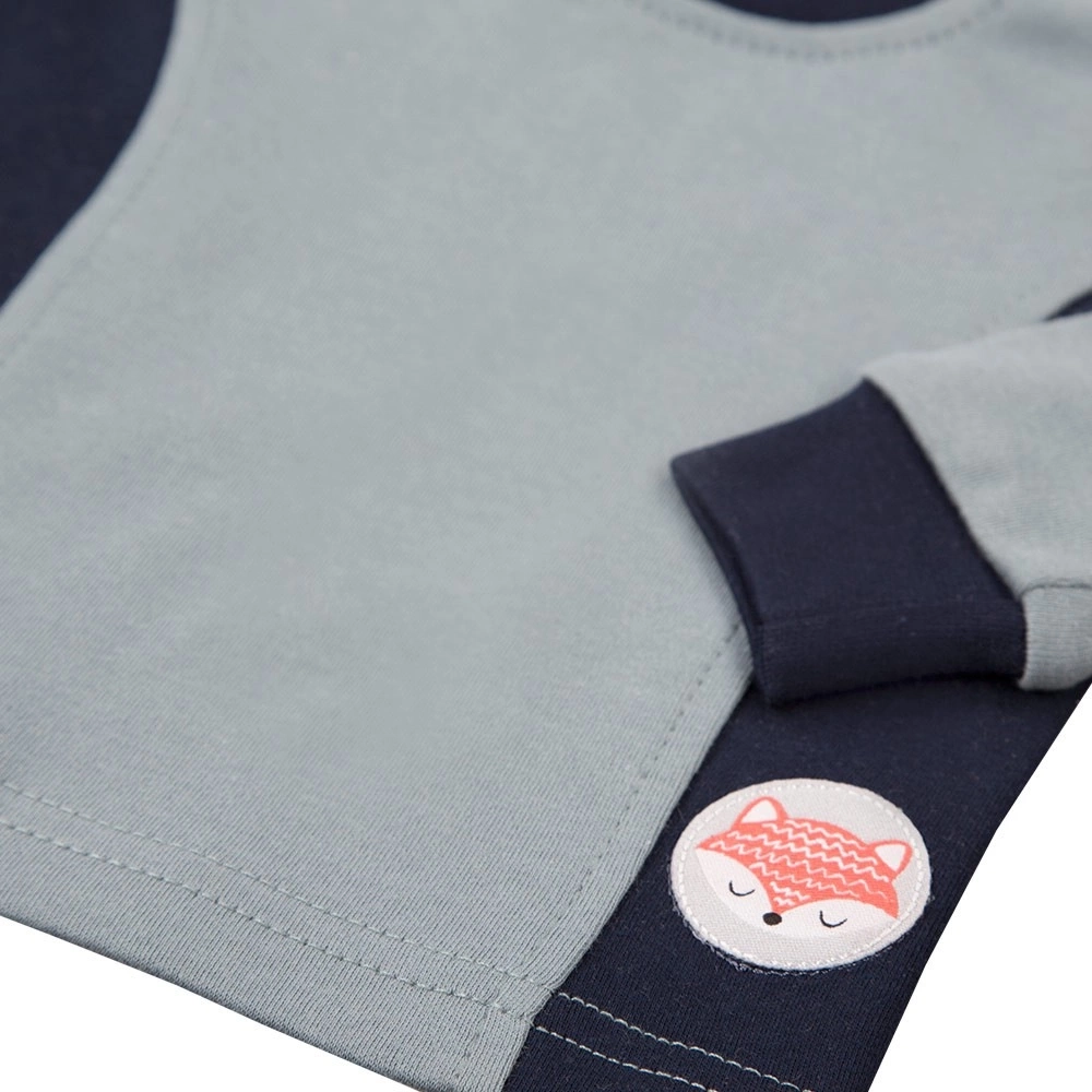 Dziecięca bluzka z kolekcji "Adventure" uszyta z miękkiej i przyjemnej w dotyku stalowej dzianiny, bawełnianej. Bluzka wykończona jest miękkim kontrastującym, granatowym ściągaczem. Bluzka jest rozpinana na ramionku do rozmiaru 80 włącznie. Elementem ozdobnym jest naszywka z liskiem. Bluzka dziecięca idealna na spacery oraz zabawę na placu zabaw.