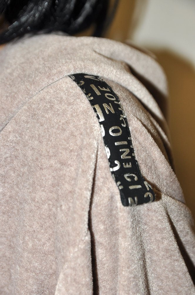 Krótki szlafrok damski z kapturem, z melanżowego weluru. Na wysokości bioder wygodne kieszenie, z tyłu, w linii talii gumka. Pasek wszyty na stałe. Ramiona i pasek z czarnym lampasem z połyskującymi napisami. Szlafrok świetnie dopasowuje się do kształtu ciała, jest niezwykle miękki i lekki. Otulenie się nim po kąpieli to sama przyjemność!