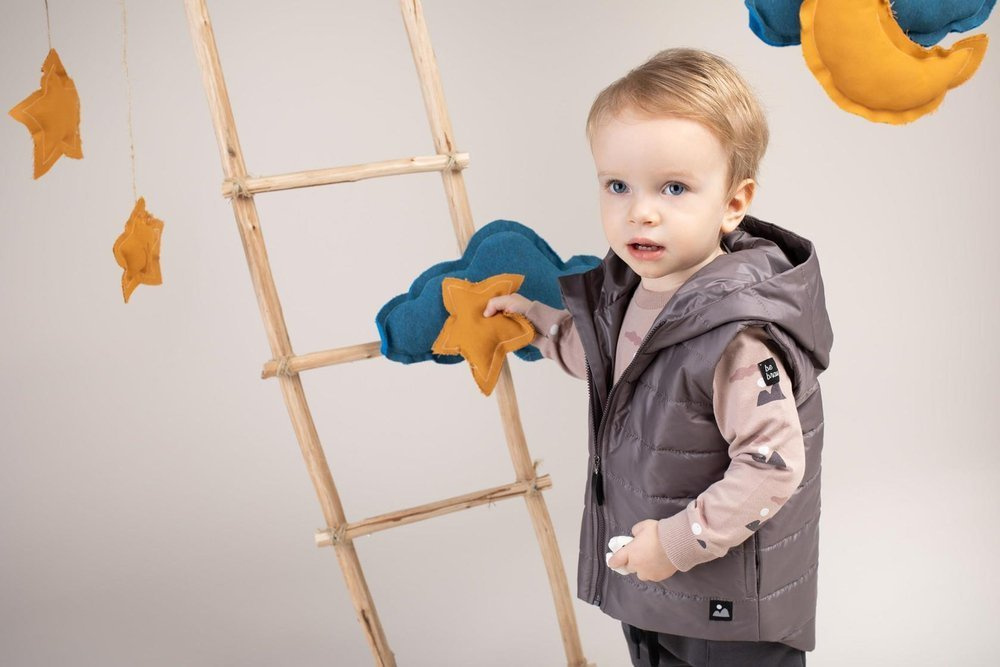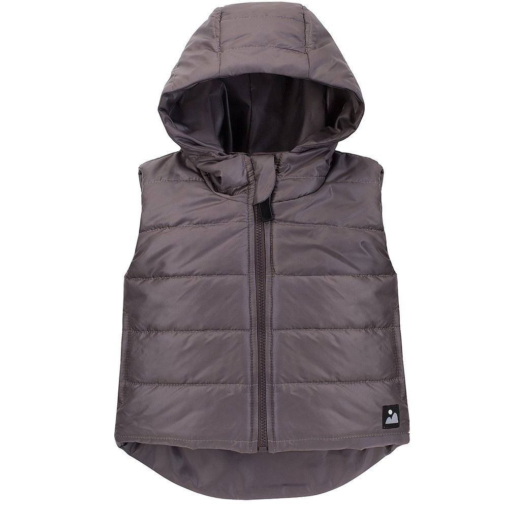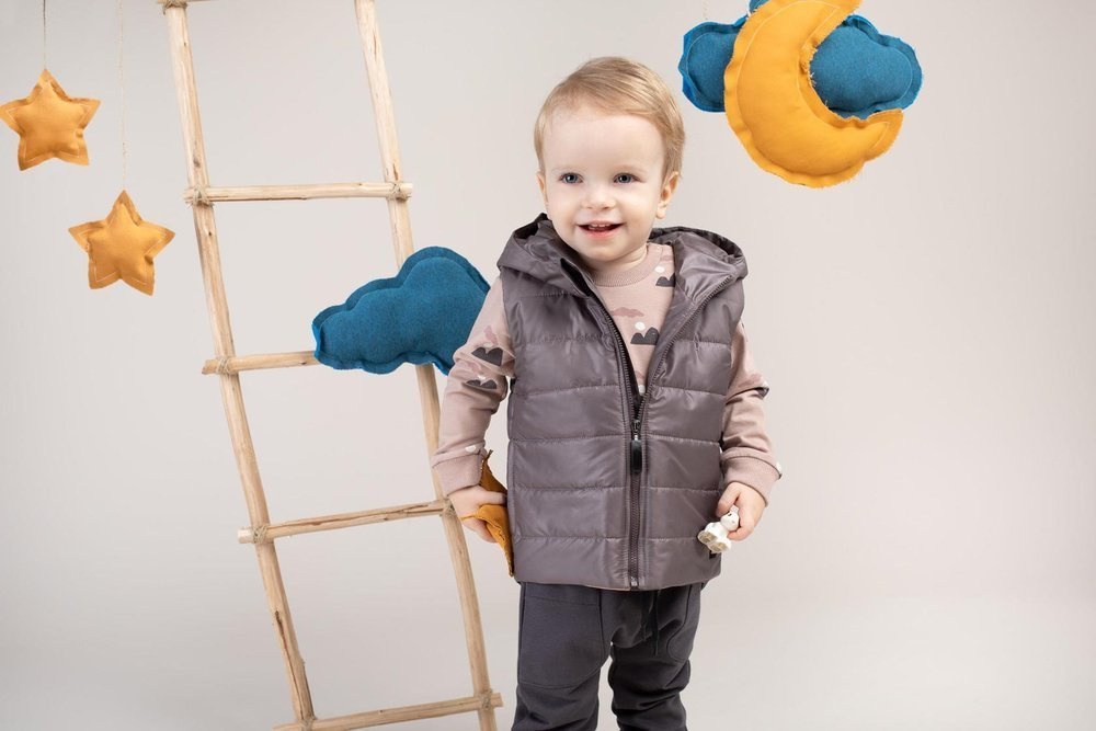 Przyjemna kamizelka dziecięca zapinana na zamek z kapturem.