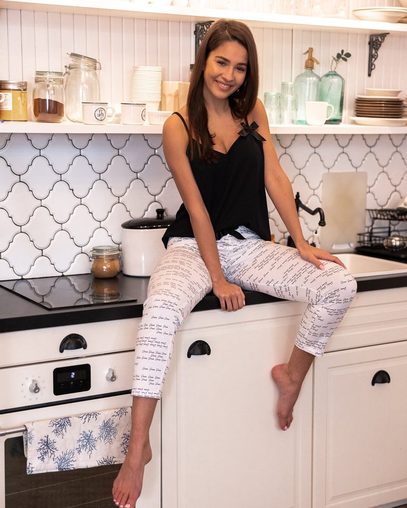 Zapytaj o produktPiżama damska wykonana z wysokiej jakości bawełny, która w połączeniu z luźnym fasonem daje maksymalny komfort noszenia. Zapewnia pełną swobodę ruchów. Bluzka na wąskim ramiączku, ozdobiona kokardką. Spodnie wzorzyste, o prostym fasonie, z długimi nogawkami. Całość prezentuje się doskonale. Bardzo wygodny fason, delikatnie dopasowany do ciała. Spodoba się kobietom, które uwielbiają delikatność i swobodę.