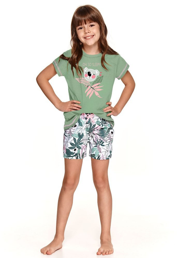 Piżama dziewczęca wykonana z wysokiej jakości wyjątkowo miłej i miękkiej bawełny. Koszulka z krótkim rękawem oraz ozdobnym kolorowym nadrukiem .Do kompletu krótkie wzorzyste spodenki