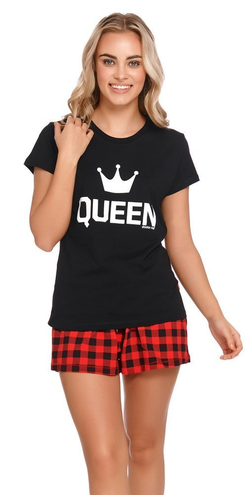 Dwuczęściowa piżamka firmy Doctor Nap wykonana z wysokogatunkowej bawełny. Idealna na dobry sen i na wspaniały początek dnia przy pierwszej porannej kawie. Luźna bluza z krótkim rękawem, nie krępuje ruchów i ładnie podkreśla sylwetkę. Dekolt okrągły, bluzka jednolita. Ozdobiona napisem Queen. Spodnie krótkie, wzorzyste, w pasie wykończone gumką. Przyjemna w dotyku piżama, utrzymana jest w ciekawej kolorystyce.