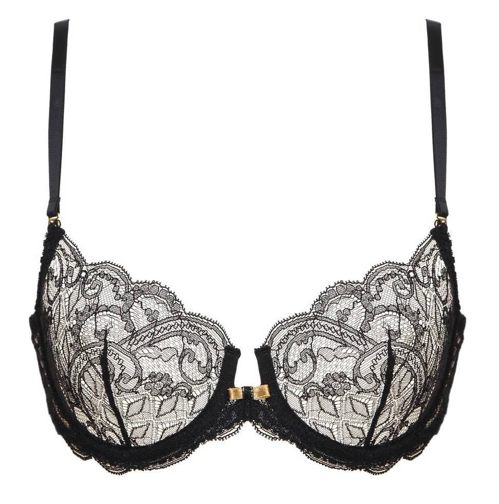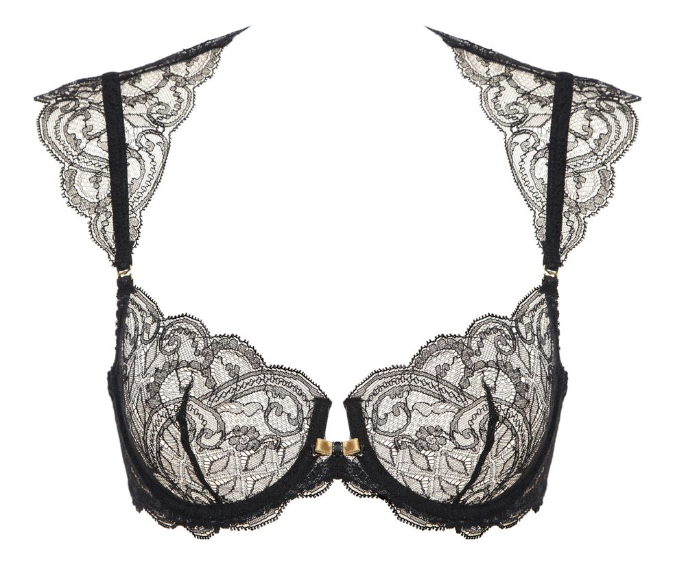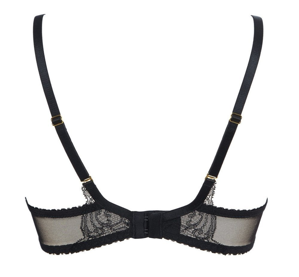 Zmysłowy biustonosz typu soft w kolorze klasycznej czerni. Został wykonany z delikatnej, francuskiej koronki Noyon Dentelle. Elegancka, złota kokardka umieszczona między miseczkami dodaje bieliźnie niezwykłego uroku.