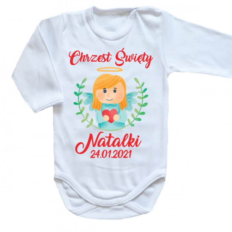 Bawełniane body dziecięce uszyte z najlepszej polskiej bawełny, która posiada wszystkie niezbędne certyfikaty. Ubranka zapinane na atestowane napy. Bodziaki mają przyklejane metki, które łatwo zdjąć i przez to nie drażnią dziecięcego ciałka. Ubranko jest funkcjonalne i wygodne. W UWAGACH PROSZĘ PODAĆ IMIĘ DZIECKA I DATĘ CHRZTU .