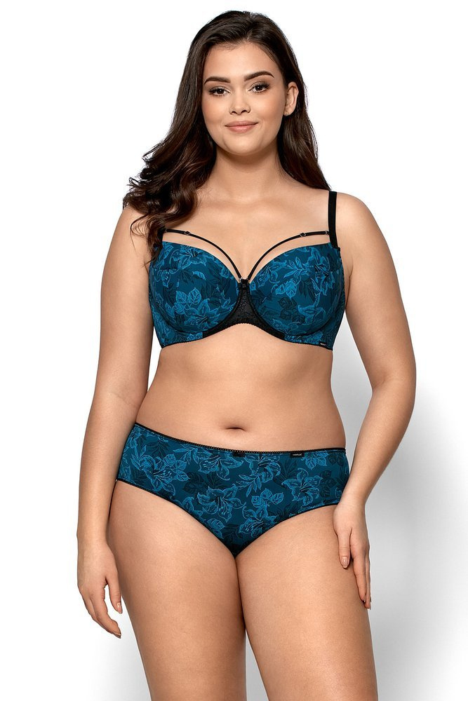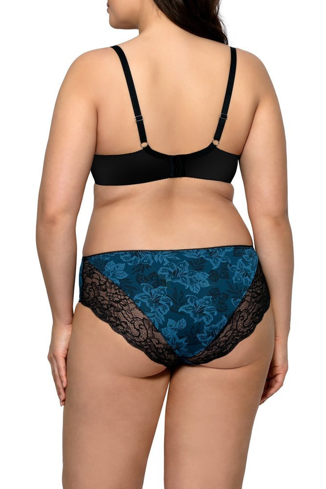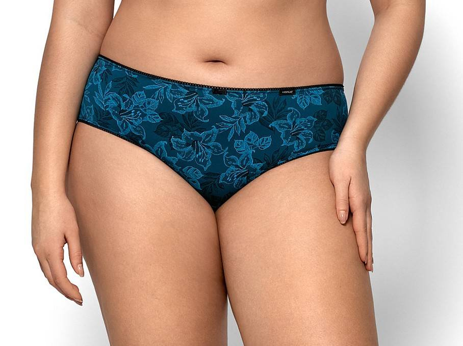 Szorty damskie z niebieskiej mikrofibry, zdobione kwiatowym wzorem. Górną linię talii podkreśla satynowa kokardka. Tył z koronkowym obszyciem.