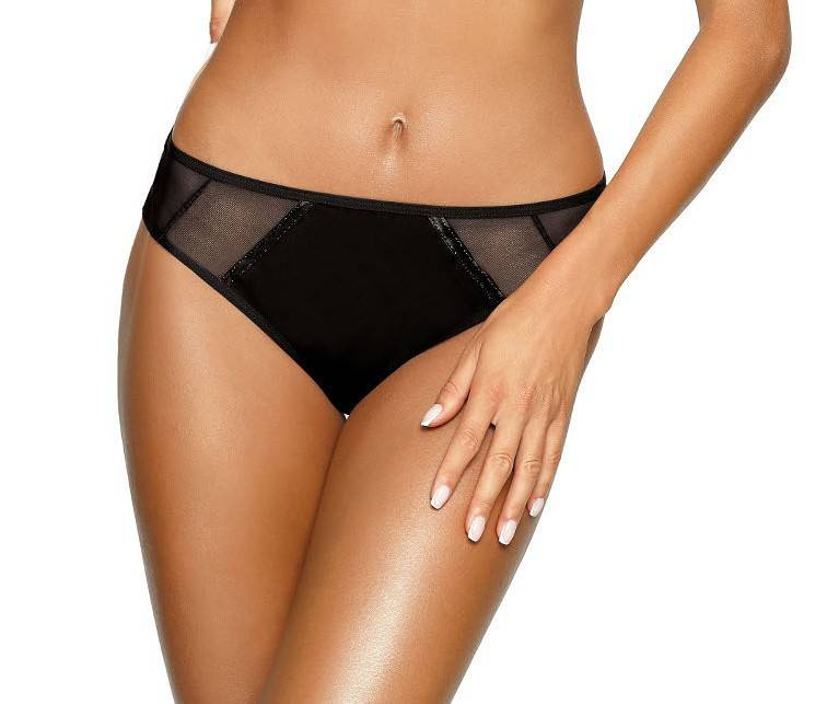 Figi o pełnym kroju z gładkiej mikrofibry i tiulowej siateczki z połyskującymi przeszyciami z kolorowa nitką lurex. Tył z wykończeniem z podwójnego tiulu. Nie odznaczają się pod ubraniem.