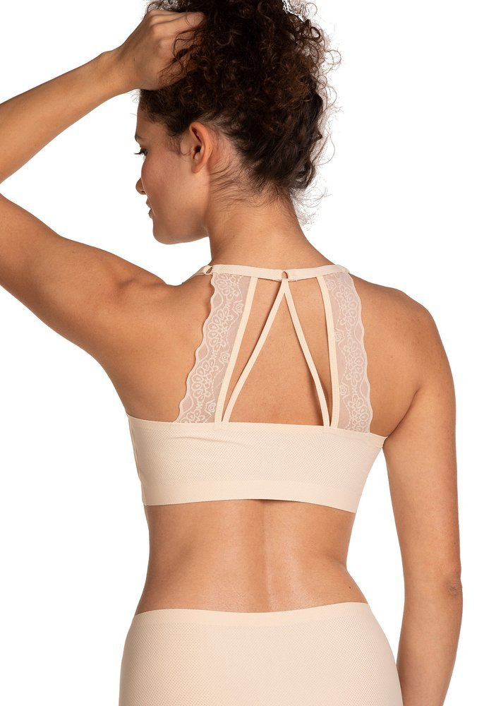 Top sportowy wykończony koronką laser cut, wykonany z elastycznego materiału dopasowuje się do sylwetki. Posiada szeroka gumę z efektem unoszenia biustu, na plecach ozdobne koronkowe wykończenie.