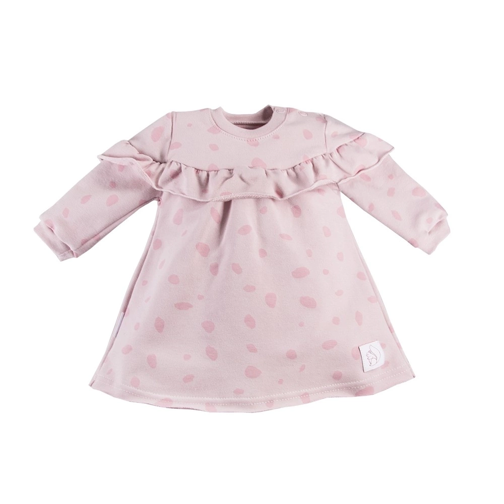 Dziecięca sukienka dresowa z kolekcji "Unique" uszyta z miękkiej i przyjemnej w dotyku dzianiny dresowej. Sukienka jest rozpinana na ramionku do rozmiaru 80. Elementem ozdobnym jest naszywka.