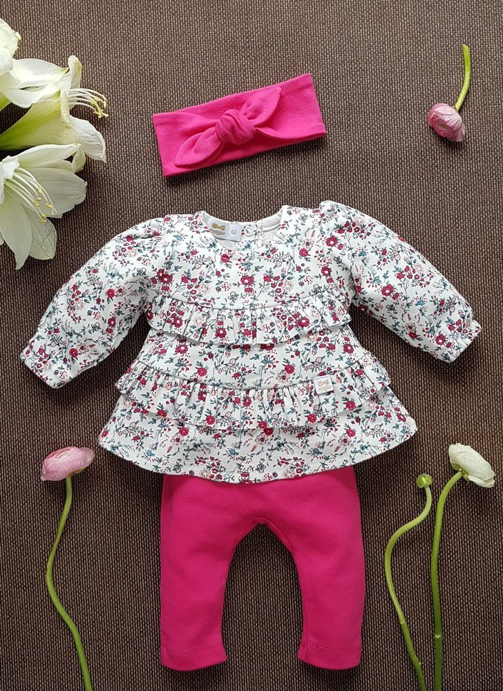 Zestaw niemowlęcy, który składa się z tuniki, opaski i legginsów. Każdy z produktów jest pakowany osobno. Ubranka wykonane ze 100% mięciutkiej bawełny zapewnią zadowolenie każdego z naszych Milusińskich.