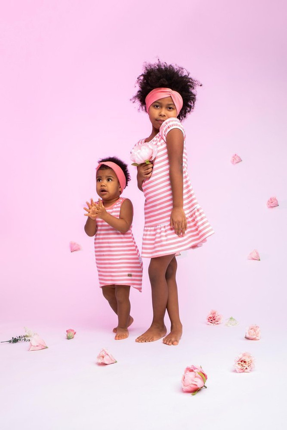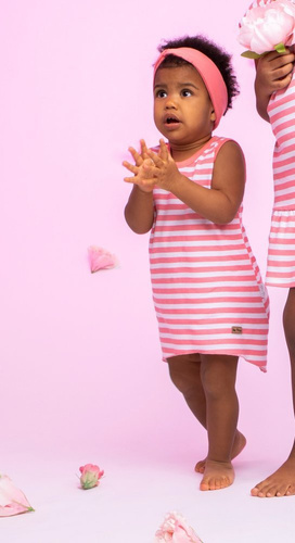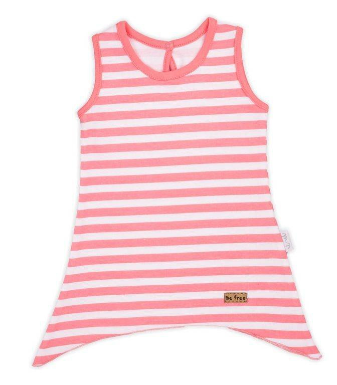 Dziewczęca sukienka w kolorze białym. Ozdobiona nadrukiem w paski. Luźny fason nie krępuje ruchów. Sukienka zapinana jest na plecach, co znacznie ułatwia ubieranie i rozbieranie maluszka. Zatrzaski wykonano z antyalergicznego, bezpiecznego tworzywa bez dodatku niklu. Doskonałym uzupełnieniem dla sukienki będzie kamizelka oraz opaska z kolekcji Alice.