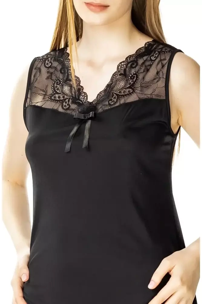 Koszulka dedykowana kobietom kochającym wygodę i styl. Górna część koszuli nocnej posiada koronkowe zdobienie w kształcie litery V na dekolcie, co pięknie podkreśla biust. Całość zdobi delikatna, dziewczęca kokardka, dodająca powabu i delikatności.