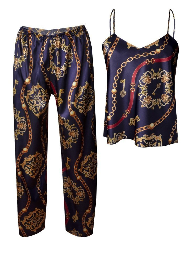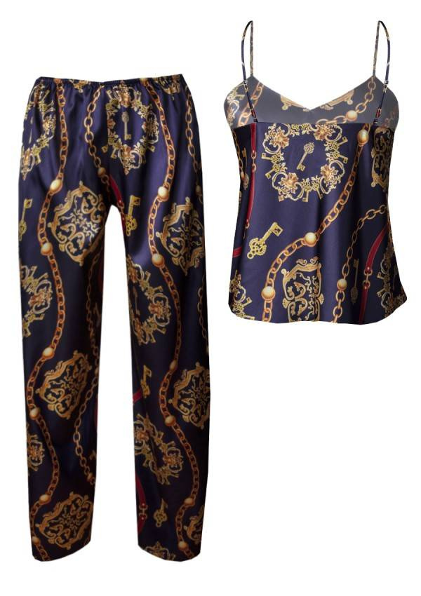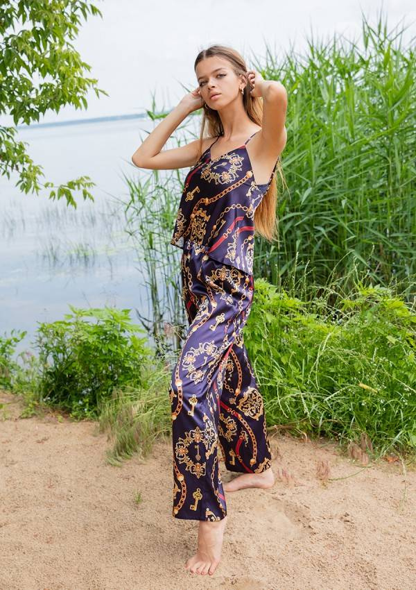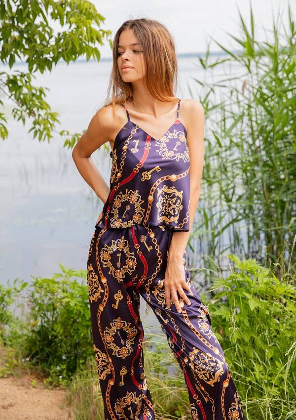Prosty, zmysłowy dwuczęściowy komplet składający się z koszulki oraz długich spodni. Odważny dekolt w kształcie litery „V”, który jest niezwykle kuszący. Góra koszulki wykonana z drukowanej wzorzystej satyny. Wąskie ramiączka z regulacją zapewnią Tobie poczucie komfortu podczas snu. Spodnie proste, długie satynowe na cienkiej gumce dodające elegancji.