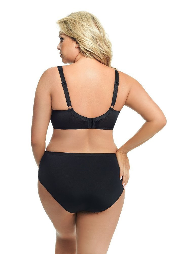 . Efektowne wysokie figi damskie wykonane z gładkiej mikrofibry. Zabudowane na biodrach, z przodu posiadają delikatną wstawkę tiulowej siateczki ozdobioną haftem. W pasie płaska wygodna gumka.