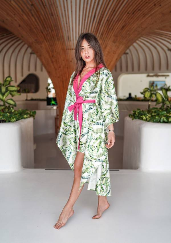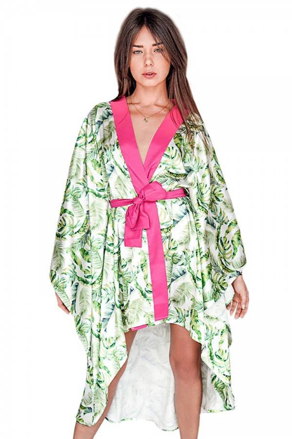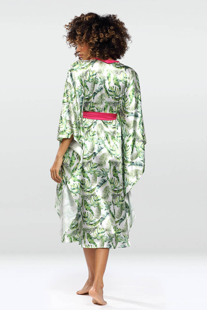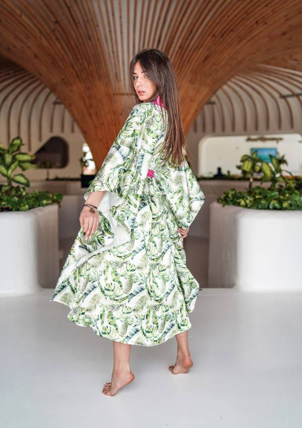 Podomka posiada długie, szerokie rękawy. Przód sięga mniej więcej do połowy ud, natomiast tył ciągnie się aż do połowy łydek. Dodatkowo, wyjątkowość podomki podkreśla jej print - na białym materiale umieszczone są zielone, tropikalne liście.