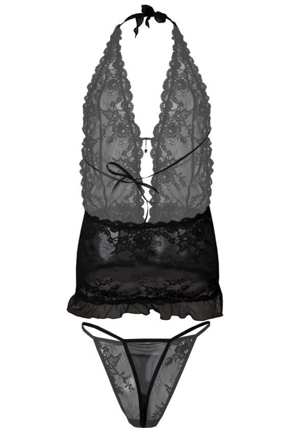 Koszulka posiada uwodzicielski, głęboki dekolt, sięgający niemal do pępka. Przy biuście jest on ozdobiony malutkim diamencikiem. Obcisła koszulka zakończona jest delikatną falbanką. Majteczki z Kompletu Hailey posiadają koronkowy przód, natomiast tył wykonany jest z gładkiego, przezroczystego materiału.
