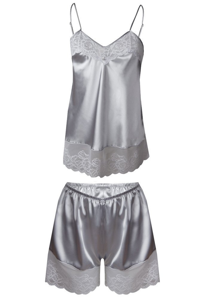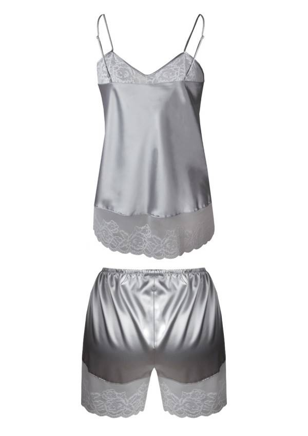 Komplet Isabella to propozycja seksownej piżamy damskiej wykonany jest z przyjemnej w dotyku, jak i noszeniu satyny w szarym kolorze.