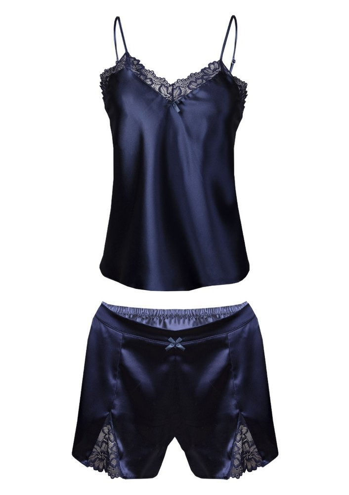 Komplecik ten składa się ze zwiewnej koszulki na cieniutkich ramiączkach oraz luźnych spodenkach na elastycznej gumce. Góra koszulki obszyta jest ciemnogranatową koronką w kwiatowy wzór.