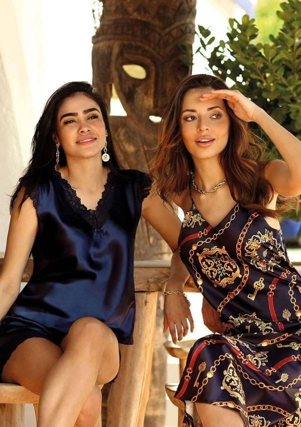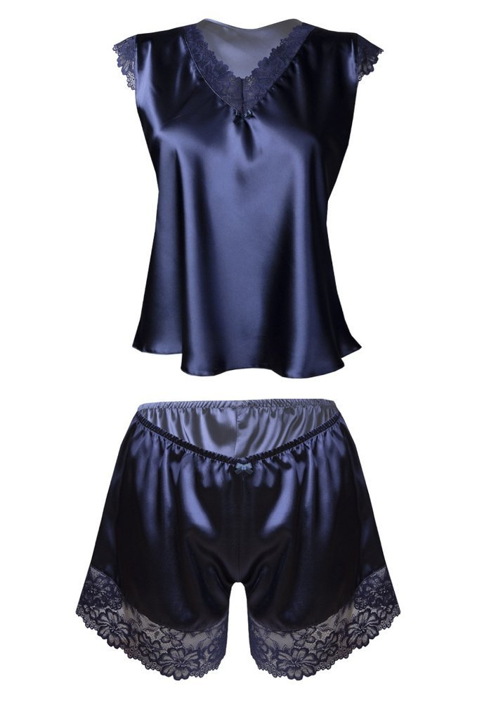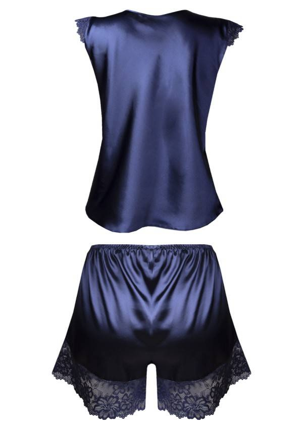 Ta piżama satynowa damska składa się z koszulki oraz krótkich spodenek z elastyczną gumką w pasie. Top posiada szerokie naramki. Obydwie są obszyte malutkim koronkowym materiałem w kolorze ciemnogranatowym. To sprawia, że koszulka zyskuje krótki rękaw. Ta sama kwiecista koronka jest również wszyta przy dekolcie oraz na zakończeniu nogawek. Na środku biustu oraz na górze spodenek przyszyta jest urocza, mała kokardka. Komplet Skaylor wykonany jest z delikatnego materiału satynowego.