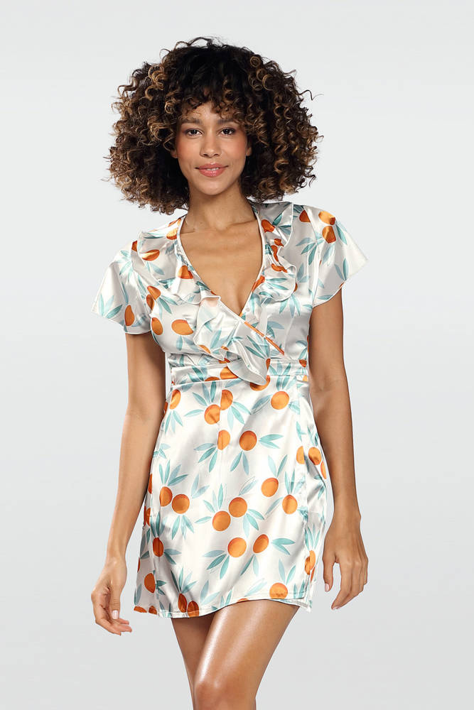 Szlafroczek - idealny na długie, leniwe poranki, ale również doskonale sprawdzi się jako wygodna narzutka na plaży. Podomka Andrea przywodzi na myśl słońce i wakacje! Wszystko to sprawia jej kolorowy, radosny print. Na satynowym materiale, z którego uszyta jest podomka, można ujrzeć pomarańcze , zielone listki. Niewątpliwie nadruk ten kojarzy się z ciepłem, latem i pysznymi pomarańczami.