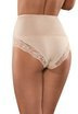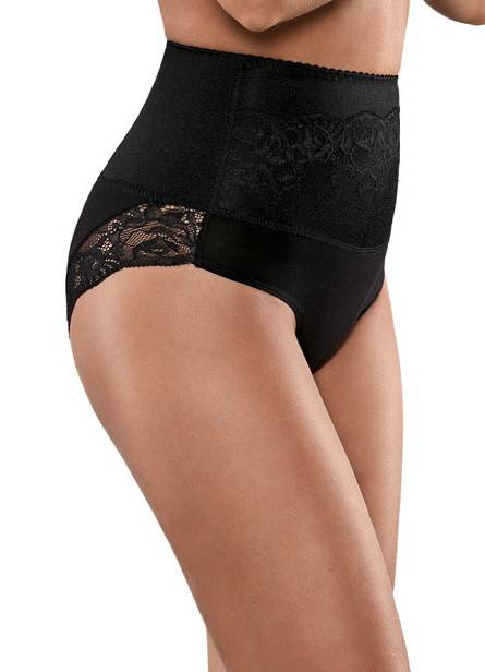 Modelujące figi damskie o wysokim, zabudowanym kroju. Pas z nierozciągającego się materiału. Idealna korekta brzucha i bioder. Pas i pośladki zdobi delikatna koronka o kwiatowym motywie. Dolna część z bawełny