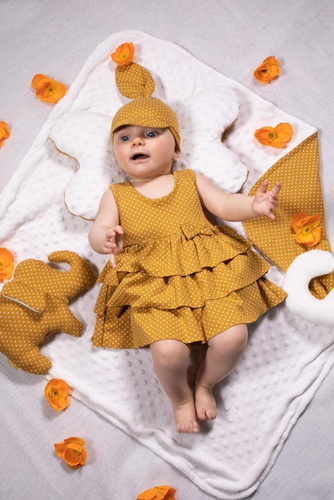 Musztardowa chustka dla dziewczynki w kropki. Sprawdzi się podczas wiosenno-letnich wyjazdów i spacerów. Dobrze przylega do główki. Zapewnia dziecku ochronę głowy przed słońcem. To doskonałe uzupełnienie stylizacji ubranek z kolekcji Michalina.