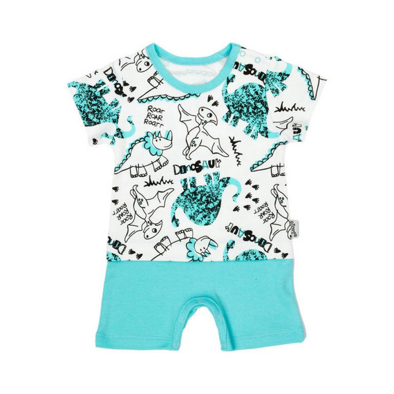 Bawełniany rampers z nogawkami. Model zdobi uroczy nadruk dinozaurów, wykonany trwałą i bezpieczną metodą farb wodnych. Możliwość rozpinania rampersa w kroku i na lewym ramieniu znacząco ułatwia ubieranie i przewijanie dziecka. Zatrzaski wykonano z antyalergicznego, bezniklowego tworzywa. Rampers Dino to niezbędny element letniej garderoby maluszka. Doskonale sprawdzi się podczas wakacyjnych wyjazdów i wiosenno-letnich spacerów.