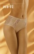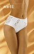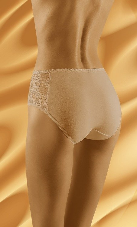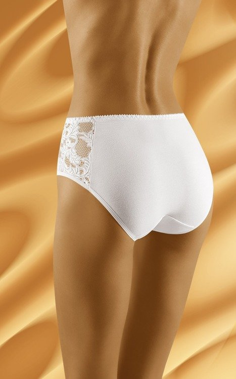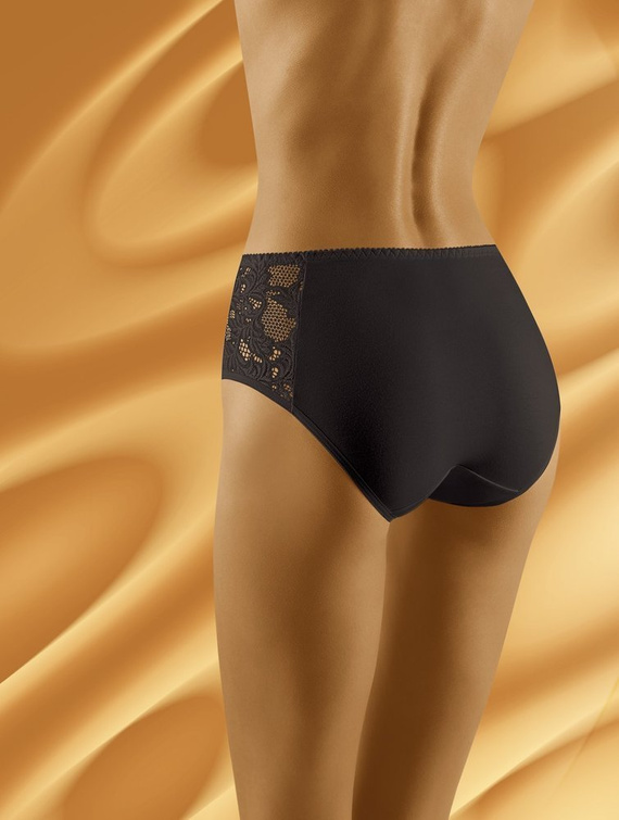 Figi damskie zostały wykonane z wysokiej jakości bawełny oraz z dodatkiem włókien elastycznych. Przód i boki zdobią wstawki koronki. Wysokie, zabudowane na biodrach. Tył jednolity.