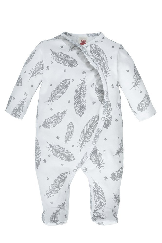 Bawełniany pajac w piórka. Rozpinany, co umożliwia łatwe i szybkie ubieranie dziecka. Zapewnia swobodę użytkowania i nie krępuje ruchów dziecka. Dostępny w rozmiarach 56-86.