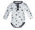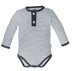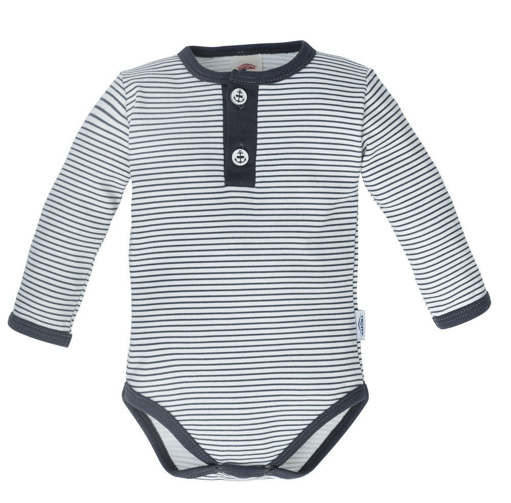 Niemowlęce body polo z długim rękawem w paski i ciekawym odcieniu granatu. Nadruk wykonany został bezpieczną metodą farb wodnych, która zapewnia im trwałość nawet po wielu praniach. Body zapinane jest na ozdobne guziki.