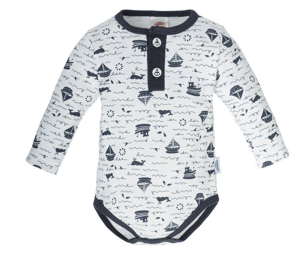 Niemowlęce body polo z długim rękawem w paski i ciekawym odcieniu granatu. Nadruk wykonany został bezpieczną metodą farb wodnych, która zapewnia im trwałość nawet po wielu praniach. Body zapinane jest na ozdobne guziki.