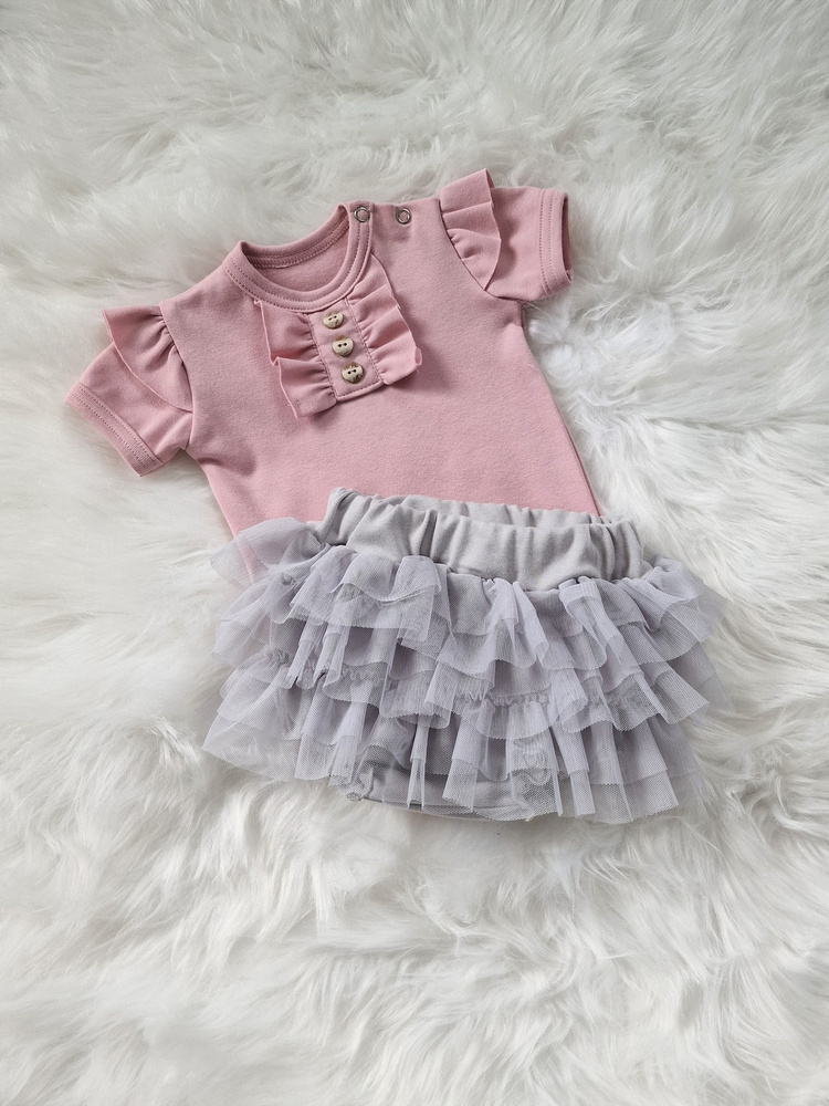 Produkowany jest z dwóch surowców - karczek i podszewka uszyte są z bawełny, do której doszyte są suto marszczone falbany z najwyższej jakości tiulu. Majteczki w nogawkach mają wszyte gumki aby ładnie dolegały do nóżek dziecka.