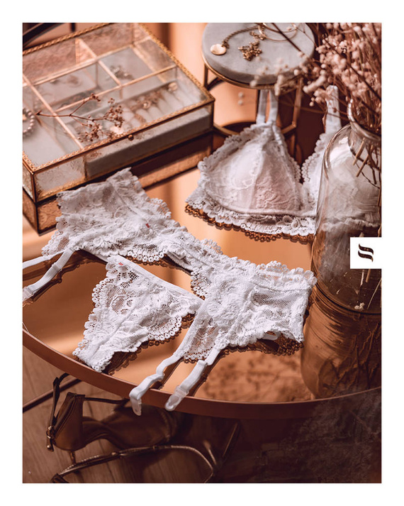 Uwodzicielski komplet wykonany z koralowej koronki o kwiatowym motywie. Biustonosz na wąskich ramiączkach z regulacją, miseczki delikatnie usztywnione. Zapięcie trzystopniowe na podwójną haftkę. W komplecie stringi i pas do pończoch z troczkami z regulacją długości.