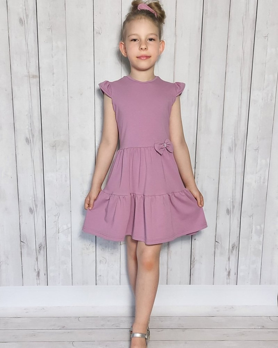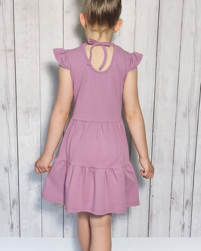 Dziewczęca sukienka w kolorze wrzosu. Luźny fason nie krępuje ruchów.