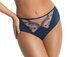 Figi damskie typu brazyliany. Wykonane z gładkiej mikrofibry, przód i tył ozdobiony wstawką transparentnej siateczki z delikatnym haftem w kolorze granatowym. Tył z podwójnego tiulu.