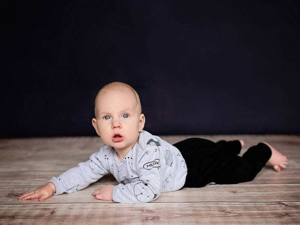 Modne spodnie dresowe z czarnej dresówki. Wszyty w pasie nieuciskający ściągacz z gumką, utrzymuje ubranko w odpowiednim miejscu. Swobodny fason spodni zapewni dziecku wygodę w trakcie nauki chodzenia, raczkowania czy zabawy.