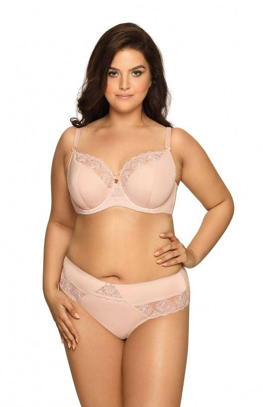 Biustonosz semi soft (półusztywniany) w kolorze delikatnego beżu. Wykonany z satynowej mikrofibry, w górnej linii tiulowa siateczka zdobiona kwiatowym motywem. Ramiączka nieodpinane, ich szerokość uzależniona od wielkości rozmiaru. Łączenie miseczek i ramiączka ozdobione satynowymi kokardkami.