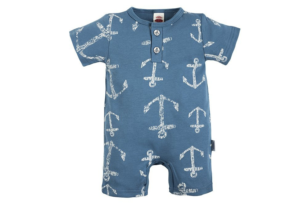 Bawełniany rampers z nogawkami. Model zdobi uroczy nadruk kotwicy i pasków, wykonany trwałą i bezpieczną metodą farb wodnych. Możliwość rozpinania rampersa w kroku i na lewym ramieniu znacząco ułatwia ubieranie i przewijanie dziecka. Zatrzaski wykonano z antyalergicznego, bezniklowego tworzywa. Rampers to niezbędny element letniej garderoby maluszka. Doskonale sprawdzi się podczas wakacyjnych wyjazdów i wiosenno-letnich spacerów.