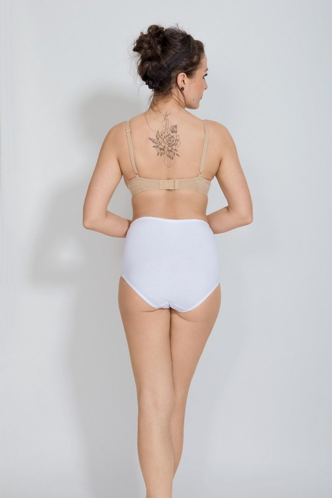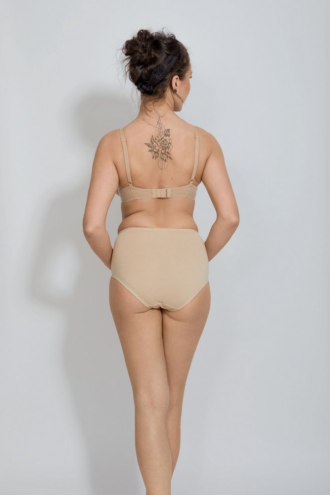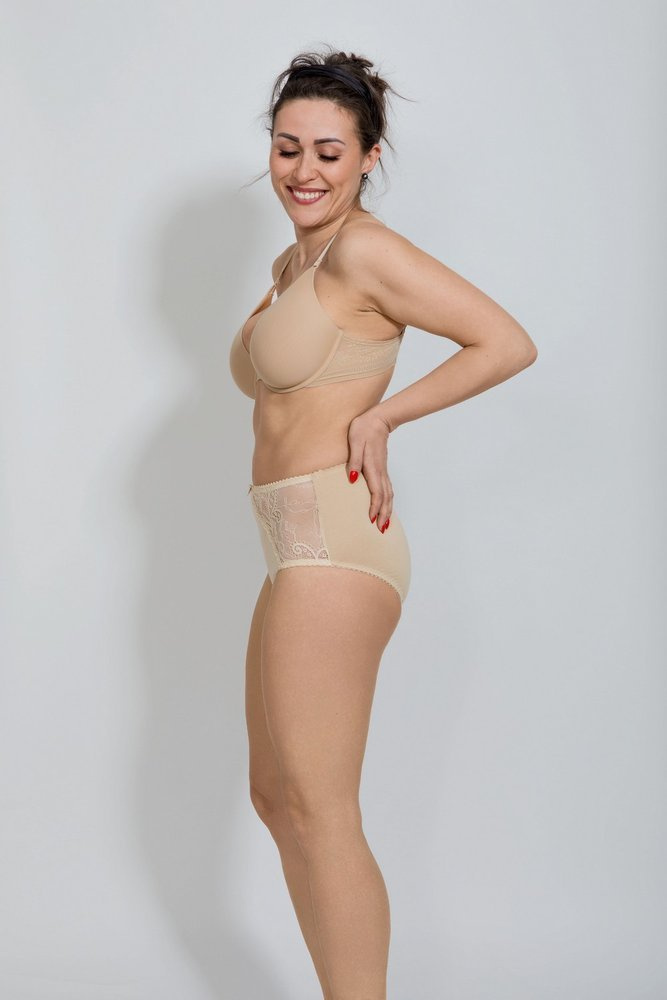 Figi damskie z wysokim stanem oraz zabudowanymi bokami. Dyskretnie modelują sylwetkę. Wykonane z gładkiej bawełny i ażurowej koronki, lekko opinają brzuch.